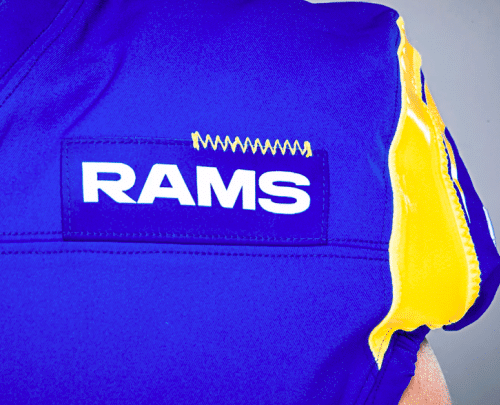Maybe the confusion surrounding the shoulder design explains the unflattering use of a team name patch on the upper-left chests of the jerseys. I’m not sure if these were inspired by military uniforms or by the advertising patches we now see on NBA uniforms but YIKES – even the new-and-unimproved Rams head logo would’ve been a nicer touch than these. Maybe these were the labels the design teams were using to make sure they don’t mistake these jerseys for the Chargers designs as they were replicating them. This is yet another element of the uniform that doesn’t connect well with Rams tradition, nor is it very functional as an identifying feature due to it’s size.